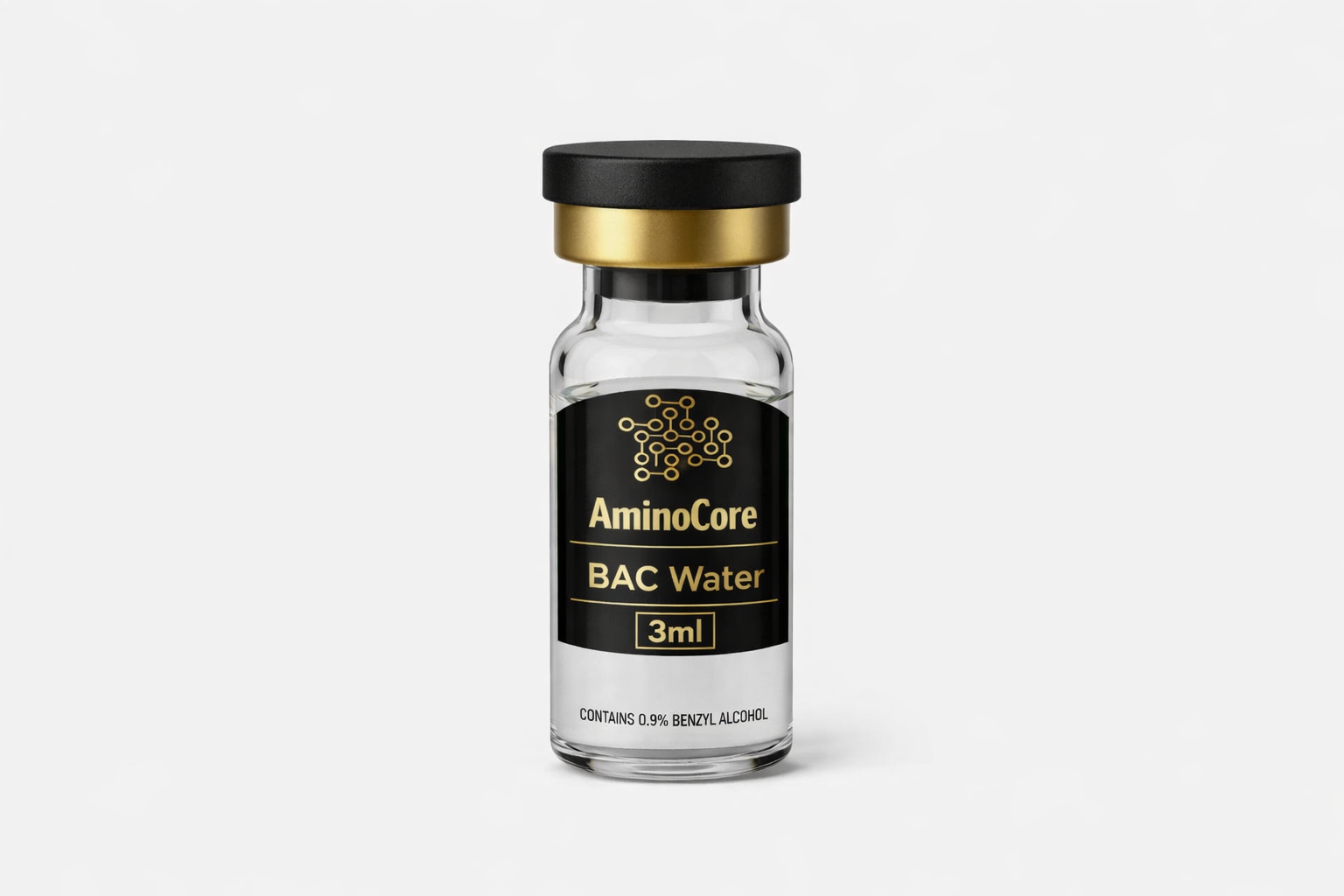 Bacteriostatic Water is sterile, non-pyrogenic water containing 0.9 % benzyl alcohol (as a preservative) designed for laboratory use in reconstitution and dilution of research compounds. It is commonly used in controlled environments for preparing peptide or protein-based materials where sterility and stability are critical. AminoCore supplies pharmaceutical-grade Bacteriostatic Water in sealed 3mL vials, ensuring quality, purity, and reliability for precise research applications.